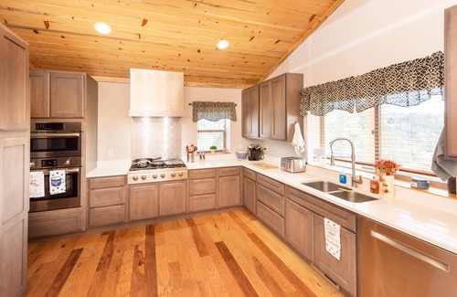 the interior of this house is just as amazing as the outside The open-plan living room has a cozy wood-burning stove and a wall of large windows to enjoy the stunning mountain views. The kitchen is well-equipped with updated appliances and plenty of space for cooking and entertaining. The dining room boasts 6 chair tables and beautiful views.