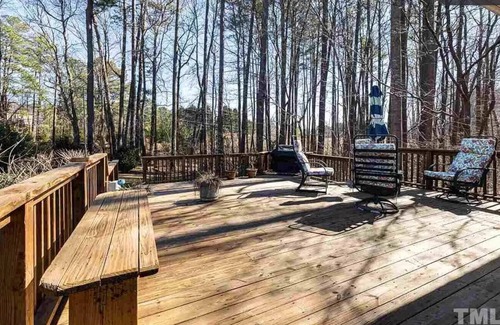 "Enjoy a stylish experience at this home retreated in the woods on a 1.2 acre lot.. RTP, Duke, UNC, NC State, Apex, Durham, Chapel Hill, RDU Airport all within 20 min drive. 2 miles from restaurants, markets including H-Mart, Harris Teeters, Wegman’s and shopping. Jet tub, huge shower , one king bed and 2 queen beds with a daybed in bonus big sunroom can be the fourth sleeping place needed. Well-equipped kitchen, brand new Maytag washer/dryer. Super speed fiber WIFI, smart TVs in all bedrooms, Coffee, tea, in sink hot water always available. all fenced backyard with huge beautiful deck..