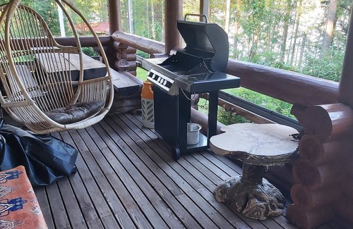 log cabin 1997 Living room/kitchen, double bed in the bedroom, double bed and 3 beds in the spacious loft (50 m²), wood-heated sauna, glazed porch, balcony. Child gates at the top of the loft stairs. Airfryer in the kitchen. Wi-Fi 4G.