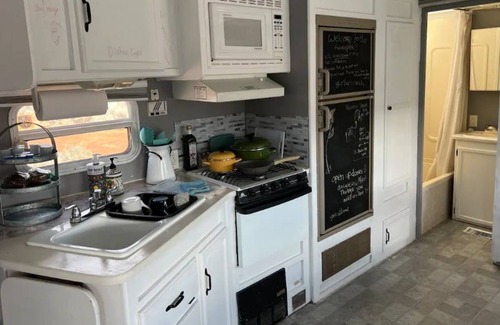 This kamper is loaded with great energy and happy vibes! The bed is soooo comfortable and has a great “Plush factor”. It does have air conditioning and great Mountain View’s! We are just off the freeway a little ways so it’s an easy stop for a snoozy. We are also in an area with almost no light pollution, so you can see the stars at night. Come roast some marshmallows and feel the awesome adventure of kamper sleeping! There is room for 3 (4 it two are small children).