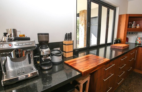 the open plan living area is decked out with a huge 8-seater modular couch, sprawled in front of a massive wall mounted tv for movie nights for the whole tribe The dining area is also complete with a dining table for 8 and the kitchen equipped with all the mod cons you could dream of to whip up those family feasts.