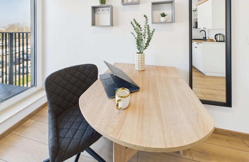 a functional and efficiently designed studio, perfect for a couple or friends looking for a comfortable stay in the vibrant heart of warsaw This cozy 15 m² studio is conveniently located, providing easy access to all the city's attractions. The studio accommodates up to two guests. In the living area, there is a sofa that, when unfolded, offers a comfortable sleeping space for two. The studio also features a balcony, providing an additional space to relax in the open air. Despite its compact size, the kitchenette is designed for convenience. It is equipped with a modern induction cooktop, a refrigerator with a freezer, a microwave, and an electric kettle, making daily tasks easier. A toaster and a dining table are also available, allowing guests to enjoy meals together. The bathroom, decorated in light tones, features a shower and a hairdryer, ensuring comfort and freshness throughout the stay. Free Wi-Fi is available throughout the studio, allowing for easy trip planning, staying in touch with loved ones, or remote work. Additionally, the apartment includes a smart TV with internet access and an HDMI cable, providing entertainment after a day of exploring. Guests also have access to a standing clothes dryer, a vacuum cleaner, an iron, and an ironing board. The building is equipped with an elevator, ensuring easy access to the apartment without the need to climb stairs. Bicycle racks are available next to the building for cycling enthusiasts. don't wait—book this compact and functional studio in a prime location today and enjoy a fantastic stay in warsaw!