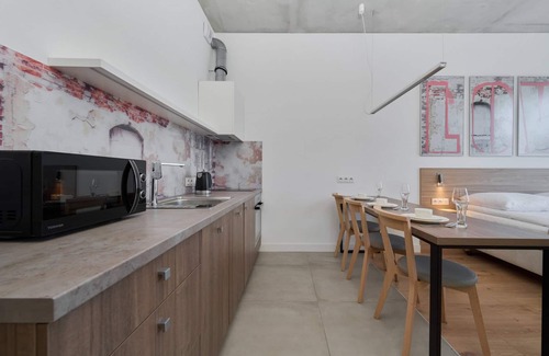the high-class studio will be perfect for 2 people - it is an ideal choice for both solo travelers and couples The 32 m² living space offers a living area with a kitchenette and a bathroom with a shower and a toilet. In addition, the studio comes with a small balcony where you can get some fresh air. The lounge area has a comfortable double bed and a flat-screen TV - a great place to rest and relax. The kitchenette is equipped with all the necessary kitchen appliances for cooking and serving meals Guests can take advantage of a welcome toiletries kit (soap, shampoo and shower gel), towels and a wide range of household items such as an iron, vacuum cleaner and washing machine, as well as an available remote work area - a desk with a chair. High-speed free Wi-Fi is available throughout the property. Thoughtful interior design, as well as comfortable furniture, ensure comfort. Modern design and attention to detail will satisfy even the most demanding guests.