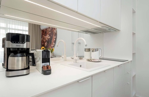 thanks to the kitchenette with an induction hob, microwave, dishwasher, and fridge with freezer, preparing your favorite meals will be a real pleasure Coffee lovers have both a drip and capsule coffee machine at their disposal.