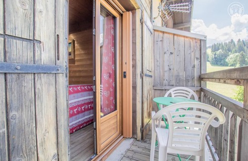 Gîte located on the first floor. Kitchen. Living room. Shower room with WC. 1 bedroom closed by a curtain (1 double bed 140x190 cm). Mezzanine bedroom (2 single beds 90x190 cm). Balcony. Shared washing machine and dryer. Common ground. Hot tub in summer. Contemporary style chalet located at the entrance of the village, opposite the ski slopes. Comfortable cottage. Pleasant mountain character. Nice volume in the stay. Common outdoor space furnished. Beautiful very clear view on the massif. Proximity to slopes + shops & services..