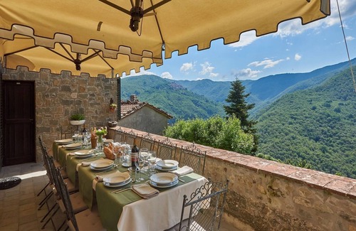 Set on the edge of the tiny village of Brandeglio, in Lucca, this lovely stone villa boasts a great location on a sloping site looking towards the forest-covered hills and down to Bagni di Lucca below. The spacious, fully furnished terrace is just the place to contemplate these captivating vistas and will easily accommodate your party of 12 when you gather for a lingering lunch or pre-dinner drinks. Venture down to the pretty garden to discover your private pool, which also offers sweeping rural views as you swim.