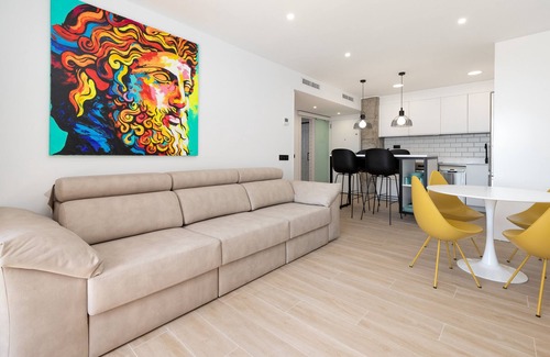 Sunny and beautiful apartment in a private urbanization located on the first line of La Concha Beach in Oropesa del Mar. Beautiful views. 2 bedrooms + 1 bathroom + front terrace overlooking the beach. Capacity for 4 people. It has a swimming pool, parking, air conditioning.Accommodation:Magnificent apartment in 1st. La Concha beach line. It has all the comforts you need for a wonderful and relaxing holiday in Oropesa del Mar.In the morning, you can cool off in the pool, which is at your disposal, so you can start the day refreshed and happy!The 70 m2 apartment has the following spaces:- Living room with comfortable kitchenette with beautiful sea views, TV-HD, sofa, central air conditioning, access to a wonderful terrace.- Terrace with frontal views of the sea, garden and swimming pool equipped with 1 sofa, 2 small tables, 2 armchairs and a relax chair.- Kitchen open to the living room with bar and dining table, fully equipped. ( Dolçe gusto coffee maker ).- Master bedroom with a 150x190cm double bed, large wardrobes and access to the terrace.- Second bedroom with lower bunk bed 135x190cm, and upper 90x190cm.- 1 Bathroom equipped with shower, sink and wc.It is delivered with bed linen, 1 hand and bath towel per person, iron and ironing board, hair dryer and welcome kitchen amenities (1 scourer, 1 kitchen cloth, 2 garbage bags, 1 washing soap, 2 dishwasher tablets, dishwasher, 2 toilet rolls per bathroom, hand gel).Services and common areas:- Community outdoor pool. (Open summer season).- Garden areas.- Free parking. On request.- Wi-Fi optional. On request (€3/day).- Community services may be limited given the current health restrictions due to the Coronavirus.Atention to guests:We will love to attend and advise you about everything you can do in this wonderful coastal area, whether with family, friends, etc.The neighborhood:Quiet residential area with a family atmosphere, ideal for sun and beach vacations. We recommend enjoying the Vía Verde Oropesa-Benicasim on a pleasant walk contemplating the sea on foot or by bicycle, with different rest areas and viewpoints, visiting the Hiking Routes: PR-CV 459”, “PR-CV 459.1”, “SL -CV 170” and “SL-CV 170.1”, the visit to the Lighthouse, the Torre del Rey and how not to let yourself be surprised by the charming Historic Center of Oropesa del Mar. We also suggest you go to the Prado de Cabanes-Torreblanca Natural Park, It constitutes an area of wetlands of great landscape value where various species of waterfowl are housed, a complete disconnection and cultural adventure for the family.Within a radius of 100 meters from the building you will find all the necessary services: restaurants, supermarkets, pharmacy, ice cream shops…How to move:- Bus: 100 meters from the apartment there is an urban bus stop and national lines.- Taxi.- Bike lane 50 meters away that allows communication with nearby towns.House's rules:- No parties.- No pets.- No more people than allowed.- Respect for neighbors and facilities.- Respect rest hours, from 10:00 p.m. to 10:00 a.m.- No garbage in the accommodation. The deposit will be made from Monday to Sunday from 8:00 p.m. to 11:00 p.m.- Check-in after 9:00 p.m. carries a supplement of EUR 30.- Check-out before 09:00 carries a supplement of EUR 30..