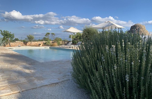 "la janca" has a wonderful design pool, for common use, 50 sqm large and panoramic view of the surrounding countryside, dotted with the typical trulli called "Pajare", of pines, olive trees and the typical Mediterranean vegetation, with elegant furnishings in order to comfortably enjoy the sun, the colors and scents of the enchanting Salento and a refreshing outdoor shower perfect for relaxing and having fun in total privacy.