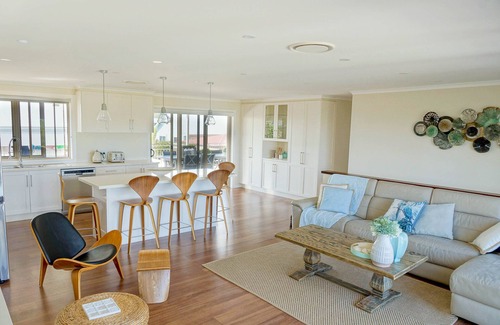 spacious open plan living with large sliding doors opening to the front balcony that looks out to the ocean The stunning views can be enjoyed from the living areas and from the stunning kitchen featuring stone benchtops, gas cooking and large island bench - that also serves as a breakfast bar.