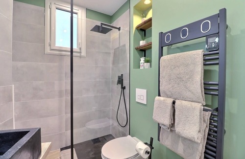 the apartment has been tastefully decorated and fitted with high-quality amenities to ensure a pleasant and comfortable stay: reversible air conditioning, smart tv, fiber-optic wi-fi, double glazing, recessed lighting, bed linen and towels provided (bath sheets, towels, bath mat)
