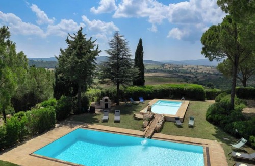 Large independent villa located in a perfect position to have total tranquility but always having all the daily needs at hand. Beautiful villa "La Veduta", 100 m a.s.l detached. 16 km from the centre of Grosseto, 29 km from the centre of Talamone, 37 km from the centre of Castiglione della Pescaia, 22 km from the sea, in the countryside. Private: garden 4'500 m2 (fenced), swimming pool (12 x 6 m, depth 120 - 260 cm, seasonal availability: 01.May. - 30.Sep.). Outdoor shower, garden furniture, barbecue. In the complex: fitness room, hot tub, billiard table, central heating system, heating available only from 01.Nov. - 04.Apr.. Motor access to the house (100 m via unmade road). Parking on the premises. Shop 12 km, restaurant 6 km, railway station "Grosseto" 16 km, thermal baths "Saturnia" 46 km. Nearby attractions: Parco regionale della Maremma 26 km, Area archeologica di Roselle 26 m, Capalbio 45 km, Saturnia 46 km, Orbetello 51 km. Please note: suitable for families. Cooking courses bookable on request. Adjacent to the villa, with an independent entrance, is the caretaker's house.