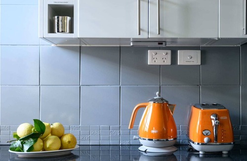 the spacious kitchen is well equipped with an induction cooktop, convection microwave, nespresso coffee machine, dishwasher, colourful kettle and toaster set, and a large fridge Coloured barstools around the breakfast bar, mats and decorative glass all stand out against the grey tile splash-backs and tiled floors.