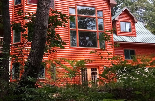 3 story custom Log home on a very quiet lake . 4 bedroom, 3 baths all with showers and one clawfoot tub. Secret room . Every room has a beautiful view. no gas motors on lake. private beachfront. 3 kayaks and 2 bicycles included . Lakes of the north Amenities include an indoor pool at the clubhouse for a small fee , an 18 hole golf course,. paved airport runway. Close to dining and shopping..