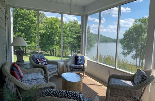 Paradise Point Peninsula describes this one of a kind Lake home. It is actually on a peninsula, surrounded by water on all three sides of a 900 foot waterfrontage lot. A 3 bed, 3 bath home: Master downstairs and 2 bedrooms up with private baths, We didn't skip any luxuries: granite kitchen, large fireplace, windows everywhere to capture the total panoramic view. Also there is a large 10x40' screened porch for dining, relaxing or even sleeping.You've never experienced a get away like this. You can walk along the private park like shoreline for 900 feet or simply sit on the double dock with sundeck for a water reflective moment. Built with high end materials and professionally decorated to give you a lake lover's lodge retreat that is unsurpassed. Once you visit you'll never forget our slice of paradise and long to return year after year..