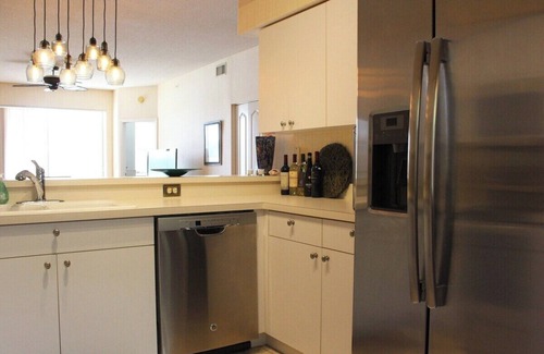 when entering this tropical condo, you will find yourself completely surrounded by nature, with gorgeous manicured landscaping all around The front patio offers seating for two. Perfect spot to watch the sunrise! The living room will be you and your families go to spot. The large sectional and movable ottoman this is the perfect area to relax after a long day of adventure. Through the sliding doors you will enter the back patio which is what makes this condo exquisite, with panoramic views of the lake and seating for two this will be the spot to enjoy breakfast, lunch and dinner! The dining table has large plush chairs, that can accommodate up to four comfortably. this newly updated kitchen has all the essential you need! with brand new stainless steel appliance's, and a wonderful wine cooler that will keep up to six bottles of wine chilled to perfection!