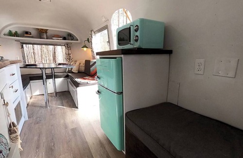 inside space: inside the airstream there is a kitchen with gas cooktop, microwave, coffee pot, small refrigerator w/ freezer, utensils and everything for your cooking needs We provide coffee, tea, sugar, flour, condiments(ketchup, mustard, mayo) along with spices and cooking oils. There is a lovely dining area (which converts into a queen bed) at the front with view of the lake and kitchen, a single bed is located in the middle and a small full bathroom is also located at the back with a very small shower/tub and composting toilet. A curtain can be drawn to separate the bathroom area from the rest of the Airstream (there is no door).