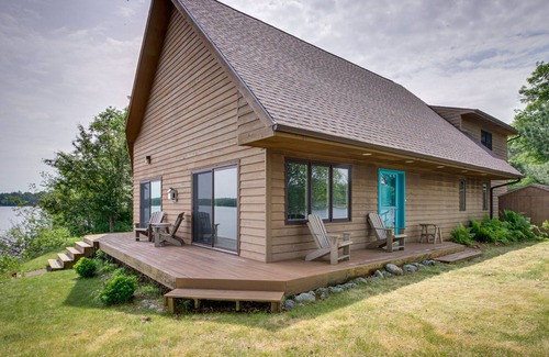 Surround yourself with picturesque views of Ruth Lake from 3 sides of the cabin when you and your loved ones escape to this vacation rental in Emily, Minnesota. Cozy up by the fireplace and watch a movie, play board games with the kids, and gaze at the water from the living room and deck. Later, cast a line from the property’s private dock or head out on the snowmobile trails. This 2-bed, 2-bath cabin is also decorated with sportsman hunting trophies and features a convenient workstation.
