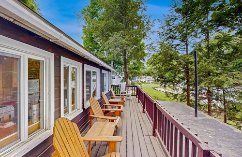 a lovely lake winnipesaukee retreat can be found at this warm laconia cabin! boasting an effortless indoor/outdoor living flow, start your mornings by brewing a cup of coffee in the well-equipped kitchen, followed by watching the sunrise on the lake view deck