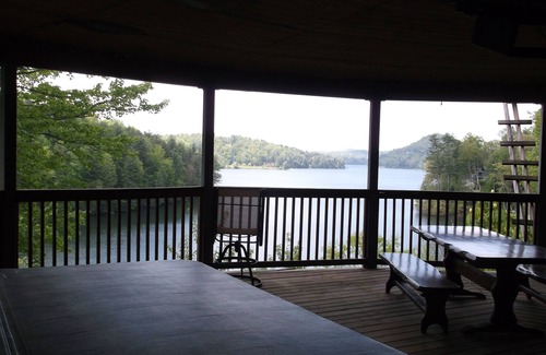everyone says it's the best view of lake glenville A secluded getaway where the calming sounds of a nearby creek falls down the mountainside. This unique, end of the road cottage feels like your hanging in the trees. This split 2BR/3BA cottage has a master suite with private bath and private TV. The 2nd BR has 2 twin beds that can be connected OR separated depending upon the situation and 2nd bath is directly outside BR. Open floor plan allows full views of Lake Glenville from both the living area upstairs as well as the open lower deck area that has a 4 person hot tub, weight machine and large solid wood picnic table as well as 3rd bathroom and storage room and laundry room. Access the lower area either from the outside stairs or the inside spiral stairs, where you will also find the laundry room.