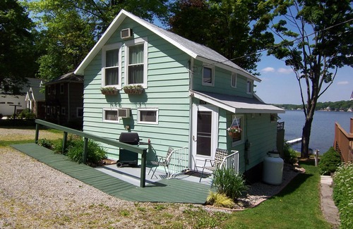 This lakefront cottage is for rent on the first basin of Lake James, one of Indiana's most beautiful sports lakes. This cottage is fully furnished with three bedrooms and one and a half baths along with an outdoor shower. The three small bedrooms [two with full-sized beds, one with a set of twin beds] and half bath are located upstairs. The living room downstairs has a full-sized pull-out couch. The front sunroom has two day beds with windows all around for enjoying beautiful Lake James sunsets. The cottage sleeps a total of 6-8 adults. The living room has high-speed internet and TV / DVD. There are remote control air conditioning units throughout the cottage. The kitchen is well-equipped with coffee maker, blender and microwave along with adjoining table area. The cottage also includes an outdoor gas grill for barbecuing, a large ground level patio with lakeside yard for games. The naturally sandy lake bottom is great for swimming, so bring all your water toys and floats. A private dock with boat tie-ups is included. (owner also has boats on the dock) Linens [bath/hand towels] and bedding included, bring your own beach towels. Two cottages, Green and Blue, are typically rented by the week in the summer time, Sat 2pm to Sat 10am. We offer these cottages by the weekend in April and Sept if no weekly bookings. We also offer for rent a 22' pontoon boat to our guests!.