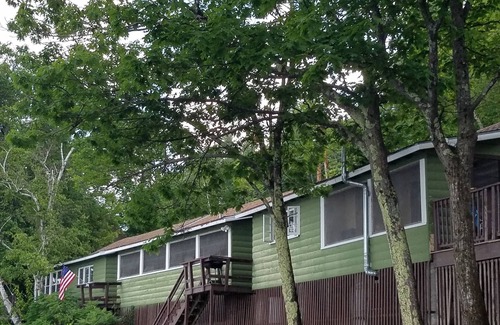 this lakefront cottage #2, sleeps 5 Private dock and large screened-in porch with 2 tables for dining or enjoying a drink while overlooking beautiful Lake Winnipesaukee and a gorgeous mountain view. This cottage has 1.5 bathrooms, 1 large master bedroom with a king-size bed, 1 sleeper sofa and 1 single size rollout bed. Charcoal grill and utensils are also provided. You must provide your own linens and towels..
