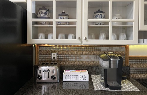 you'll find unique touches all around, from essential oil diffusers and a selection of oils to coffee bar with keurig, coffee pods, creamers and a variety of teas Two spacious bathrooms include all the essentials from shampoo, conditioner, soaps, makeup removing cloths and Q-tips to dental flossers and any other item you may have forgotten to pack. Your comfort is our primary goal. We want to make sure you feel completely at ease in our beloved lakefront property. Be our guest, please stay awhile.