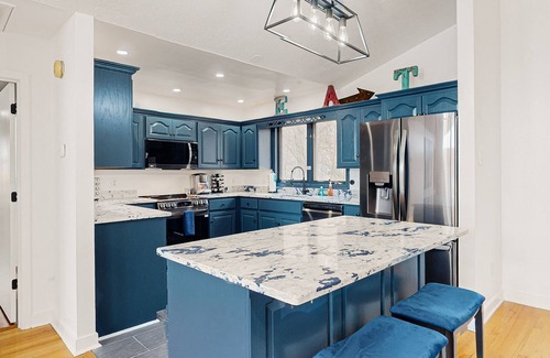newly renovated and located on the private side, it feels like a paradise resort with two kitchens and two dining areas perfect for groups that want to come together, yet desire their own space on vacation Lots of fun with two game rooms, a sandy beach, a large boat dock, a fire pit, a sandy beach, a volleyball court, a gas grill, fishing, kayaking, pedal boating, and much more! A pontoon is even available to rent for your adventures on the water.