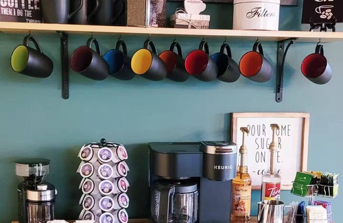 the coffee bar features a coffee machine that brews individual pods or by the carafe A coffee grinder & plenty of ceramic cups as well as to-go cups (with lids) are also there for your use.