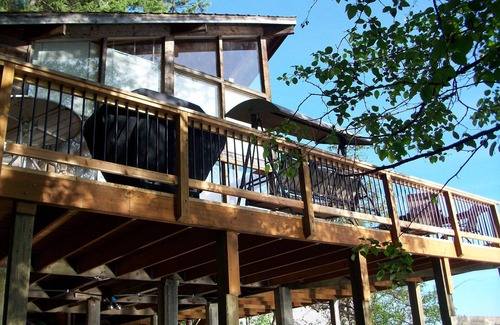 the dock to sunbath on or tie up your boat for all of your play is located directly below the cabin The cabin also has a large deck with swing, table and bench seating all around to enjoy the vista's and watch your friends and family below in the water. A barbecue on the deck makes outdoor cooking a breeze and a pebble beach with sloped entry into the water enables easy beach play.