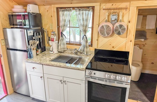 this tiny cabin is 14x14ft wide and has one main room, a bathroom, a screened-in porch, and a yard On one side, there is a queen-size bed and a bunk bed. A kitchenette and a small dining area with two chairs are on the other wall of the cabin. There is an attached and fully remodeled bathroom. The bathroom is small but equipped! Brand-new stand-up shower, toilet, and vanity. Out the front door is a marvelous screened porch with another dining table. Outside is a 6 ft picnic table, a fire pit, a gas grill, and plenty of Adirondack chairs for your group.