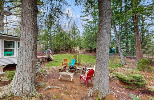 ascend a flight of 16 stairs to be rewarded with gorgeous views of the lake on three sides, as well as a private balcony that feels like it's part of the tree canopy Begin each morning with a paddle around the lake in the provided canoe, returning home to read on the lakeshore, breathe in the pine-scented air, or build a campfire in the shared fire pit. (Please note that the canoe and the firepit is shared with the property downstairs.) Back inside this 200-square-foot space, you'll find a minifridge and a microwave (but no full kitchen), a full bathroom, and recent updates that include air conditioning, free high-speed WiFi, and Roku TV is available for guest streaming with your account.