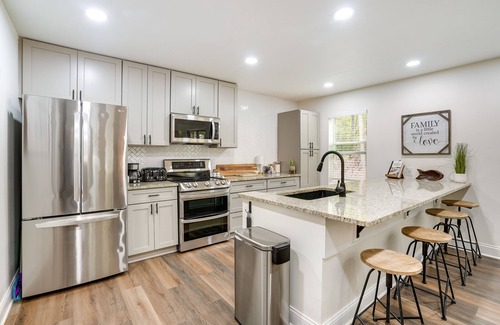 kitchen: stainless steel appliances w/ dishwasher, cooking basics, dishware/flatware, coffee maker, microwave, toaster