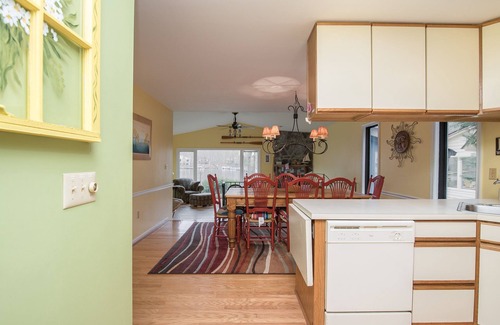 large, high ceilinged, open living/dining/kitchen space has panoramic view of lake, and is great for sharing with family and friends Wood burning fireplace for those cool fall or winter getaways. Living room opens onto large screened-in porch.