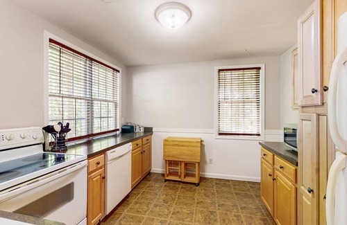 the upstairs living area offers a spectacular view of the lake, a cozy ambience, and an open floor plan for easy relaxation Adjacent to the panoramic dining area is expansive breakfast bar seating. You can keep the cook company while your cup runneth over with your choice of brew options from the coffee bar, offering traditional drip, single-cup, and espresso machines. The large kitchen includes an oven, an electric range, a dishwasher, a refrigerator with an icemaker, a toaster oven, a pop-up toaster, a crock pot, and a microwave.