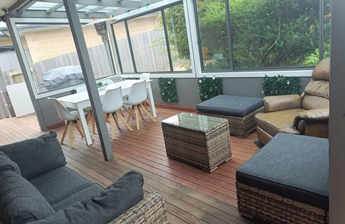 Private unit at quiet location surrounded by beautiful garden, including 3 spacious bedrooms (3 queen beds, 1 double bed and 1 futon sofabed), bathroom with bathtub and shower, separate toilet, small kitchenette with fridge, double hot plate, electric pan, microwave and basic cooking utilities. There is no indoor dining/lounge area but has dining space in the beautiful front yard with a BBQ.