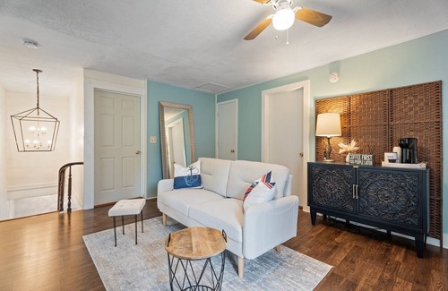 * second bedroom: king bed, charging stations, & cozy ambiance + roku tv