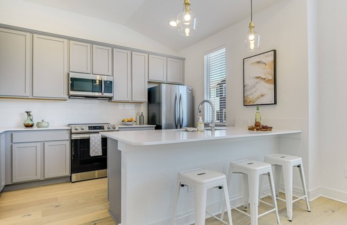 the primary suite has a large walk-in closet, a secondary closet, ensuite bath with a double sink, and walk-in shower The kitchen features a dine-in island, stainless steel appliances, quartz counters, upgraded light fixtures and a pantry and is fully stocked with everything you need to prepare a lovely meal. Recessed lighting and bright white walls give the space a light and airy feel. The townhouse is plumbed for fire suppression and the garage features a coated floor.