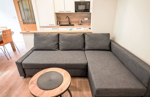 Modern apartment block "Lanovka", 4 storeys. In the centre of Jáchymov, 2.5 km from the skiing area. In the house: lift, storage room for bicycles, storage room for skis, central heating system. Parking at the house. Grocery 100 m, supermarket 150 m, shopping centre 6 km, restaurant, pub garden 100 m, bus stop "Jáchymov" 150 m, outdoor swimming pool 15 km, indoor swimming pool 150 m. Golf course (18 hole) 6 km, tennis 8 km, indoor tennis centre 13 km, minigolf 800 m, sports centre 13 km, walking paths from the house 50 m, cycle lane 300 m, ski lift 1 km, chair lift 2.5 km, slopes 2.5 km, ski rental 2.5 km, ski school 8 km, children's ski school 2.5 km, sled run 13 km, cross country ski track 500 m, ice rink 13 km, children's playground 600 m. Nearby attractions: Aqua Centre Agricola 500 m, Spa&Wellness Centre, Boží Dar 8 km, Karlovy Vary 20 km, Oberwiesetnhal 13 km, Annaberg-Buchholz 33 m. Well-known ski regions can easily be reached: Klínovec 2.5 km, Plešivec 13 km, Fichtelberg 11 km. Hiking paths: Krušnohorská magistrála, Ježíškova cesta. Please note: Additional accommodations can be booked.