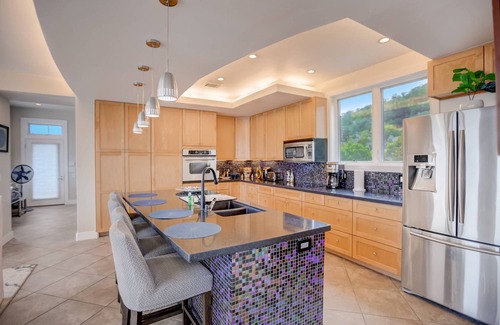 * fully equipped gourmet kitchen with stainless steel appliances and granite countertops