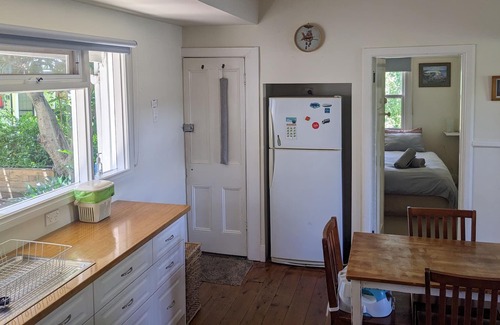 Historical renovated cottage with 2 bedrooms, full kitchen and bathroom and two one bedroom self contained studios complete with full bathrooms. Perfect for a family with older children, multiple young families, four couples, intimate events etc. There is a shed on the property which functions as a shared living space with a fireplace. There is also a shared outdoor dining area with a long table and chairs that seats 10. The block is 1400m2. There are many mature trees, native plants, edible plants and lawn areas on the property to explore and enjoy. Portacot and highchair available upon request. Pet friendly. Please note that the property is close to a train line and you can hear the trains..