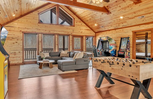 Discover a unique stay in the heart of the Smoky Mountains with these two brand-new, side-by-side cabins, perfect for large groups, family reunions, or corporate retreats! Each cabin features a private indoor heated pool, two game rooms filled with arcades, a full-size pool table, foosball, and spacious outdoor decks that offer breathtaking mountain views.