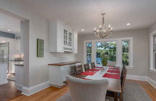 enjoy the evenings dining on the porch while looking out over the lake at the ossipee and sandwich mountain ranges Wrap up your day by the fire, where guests can toast marshmallows and enjoy the spectacular sunsets seen from this property. The main house has been fully renovated and offers four bedrooms, a well-equipped kitchen featuring a six-burner gas stove, two dishwashers, and a walk-in pantry. All bedrooms are located on the home's upper level and have central air-conditioning for a great night's sleep on those hot summer nights. Other unique features include a weight room, a covered waterfront dining area, and a private washer/dryer.