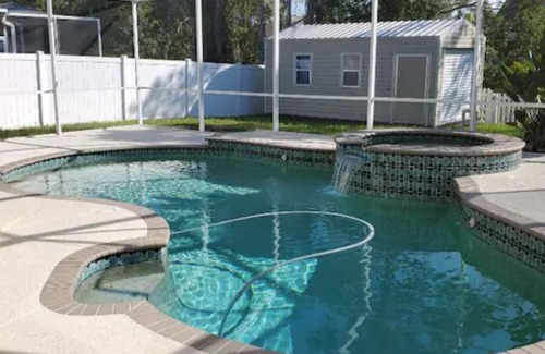 NO PARTIES OR LOUD NOISE ALLOWED! Perfect for travelers focused on fun, family, and faith. With 5 bedrooms and many sleeping options, bring the relatives! Located on a lake- bring the boat! Extensive entertaining/living space, pool + spa, + a dock on a canal. Connect with nature. Home features Christian art- if such offends you, this is not for you. Pool + spa heat is $75/day; spa only for $35/day. Near to parks, shopping, airport, stadiums, colleges, theme parks. Beaches are ~40 mi, + Disney ~50 mi.