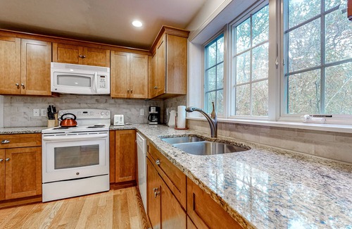 this home is tucked away in a quiet neighborhood just a few blocks from main street, plus the beach is nearby as well You’ll have an abundance of room to entertain and hang out, thanks to this home’s modern layout. The living room has a gas fireplace, comfy furnishings, and a TV with DVD player and free WiFi to keep you connected.