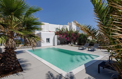 cycladic style villa, on the beautiful north area of paros “santa maria”, near naousa just on the seaside, with two swimming swimming pools One swimming pool is private and the other is shared with 5 more houses.