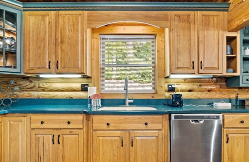 lazy bear lodge is a spacious, family-friendly log home with three bedrooms, three full baths, and a large open-concept kitchen, dining, and living room with a gas fireplace and vaulted ceiling All bedrooms are large and have new king-size beds for comfort. The lower level has a second den area, third full bathroom, laundry room, open playroom with pool table, card table and chairs, games, etc. The main living area is on the first floor. It has a full kitchen with modern appliances (double oven, stove, microwave, toaster, coffee maker) and a full complement of pots, plates, cutlery, and silverware. The dining table has seating for 10, and the kitchen bar has seating for four (If additional seats are needed, there is a card table with four chairs in the basement in the closet under the stairs).