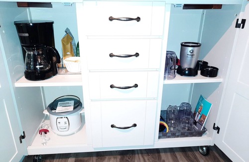 while there's no traditional stove in the suite, you'll still have the ability to prepare simple, delicious meals during your stay The suite is equipped with a small fridge, electric skillet, BBQ, rice cooker, toaster, Keurig coffee maker, dishes, wine glasses and cutlery or whether you're whipping up breakfast, grilling dinner, or just keeping your local wine chilled, we've got you covered.