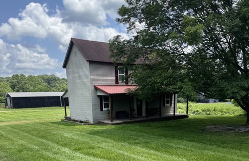 escape to the quiet beauty of hocking hills at home place, a charming farmhouse near mcarthur, oh This peaceful retreat sleeps up to 6 with 2 bedrooms (2 queens + 1 king) and a full-size pull-out couch in the upstairs TV area.