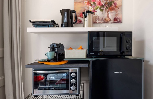 the kitchenette is equipped with a dining table, induction hob with various dishes, kettle, coffee machine, electric oven and microwave oven, refrigerator with freezer;