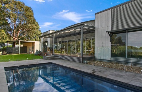 Le Pelican is a luxury 3-bedroom holiday retreat in Metung, offering stunning views and a private heated swimming pool (seasonal). It features a spacious open-plan living area, fully equipped kitchen, and outdoor dining space. The master bedroom boasts a king-sized bed with an ensuite, while the other rooms are versatile for families or groups. The property includes a home office nook, entertainment options, and multiple parking spaces. It is family-friendly and strictly no pets or parties are allowed.